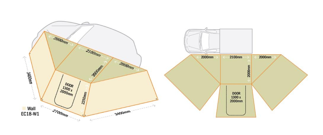 With walls fitted, the set up covers approx. 16.5m2 depending on height of vehicle.