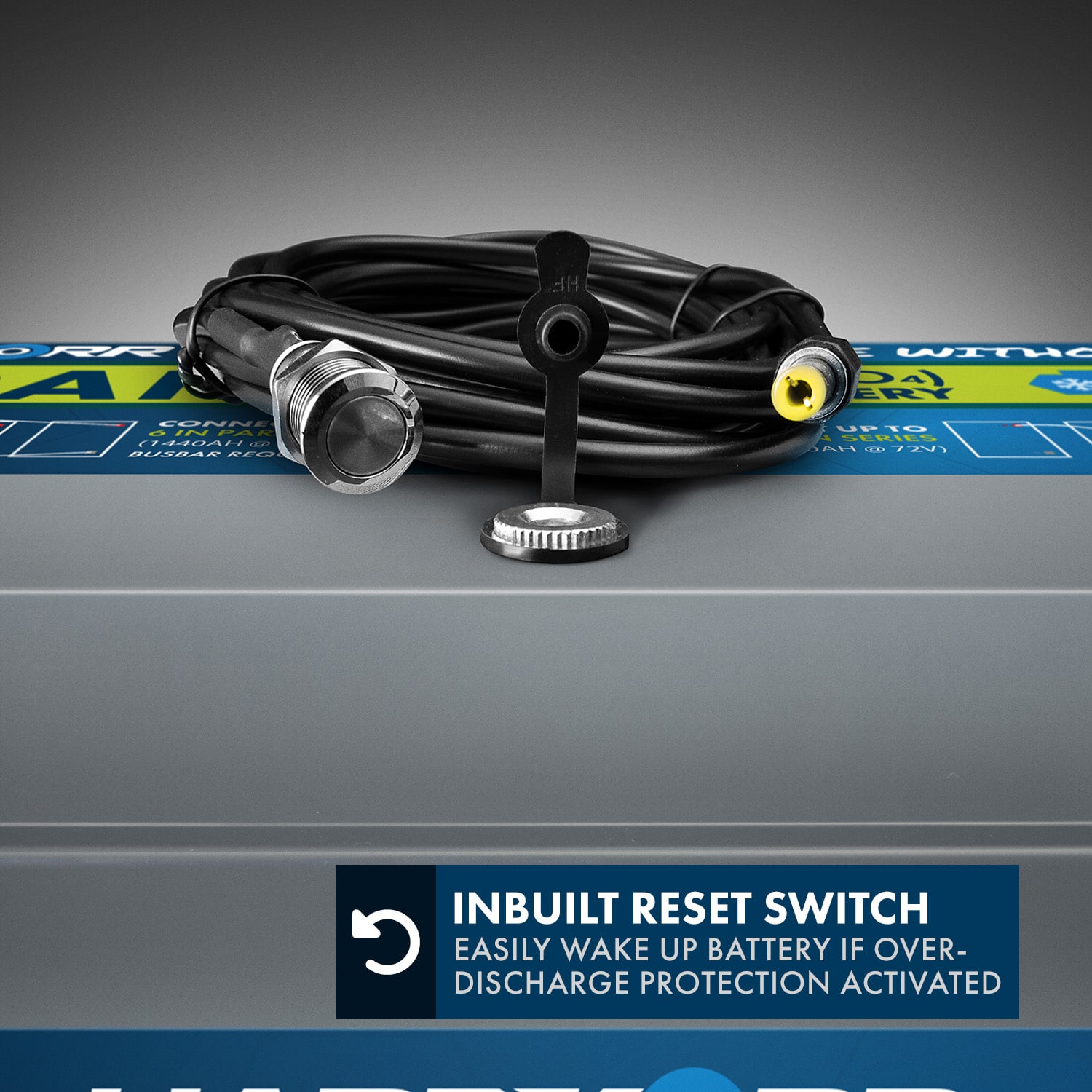 Our batteries provide an easy solution to this problem; simply connect our included remote reset switch to the socket on the top face of the battery and hold down the button for 5 seconds, and the over-discharge circuit will reset itself. The button can also be flush-mounted into your 12v setup if desired.