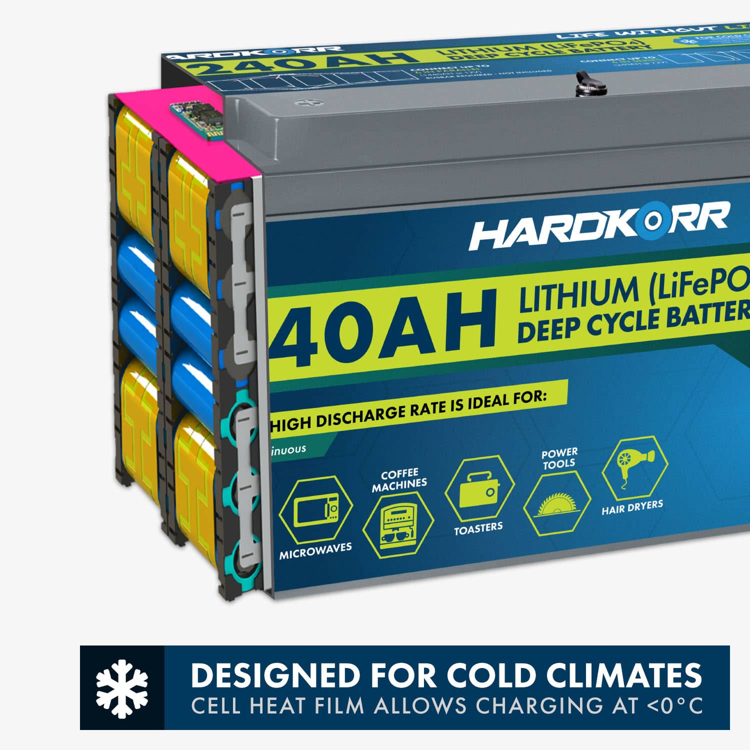 The Battery Management System (BMS) inside all lithium batteries contains a protection circuit which trips if the voltage drops below a certain setpoint. In the case of Hardkorr batteries, it is set at 10.0V. This circuit prevents damage to the battery by putting it into a ‘sleep’ mode until it is reset.
